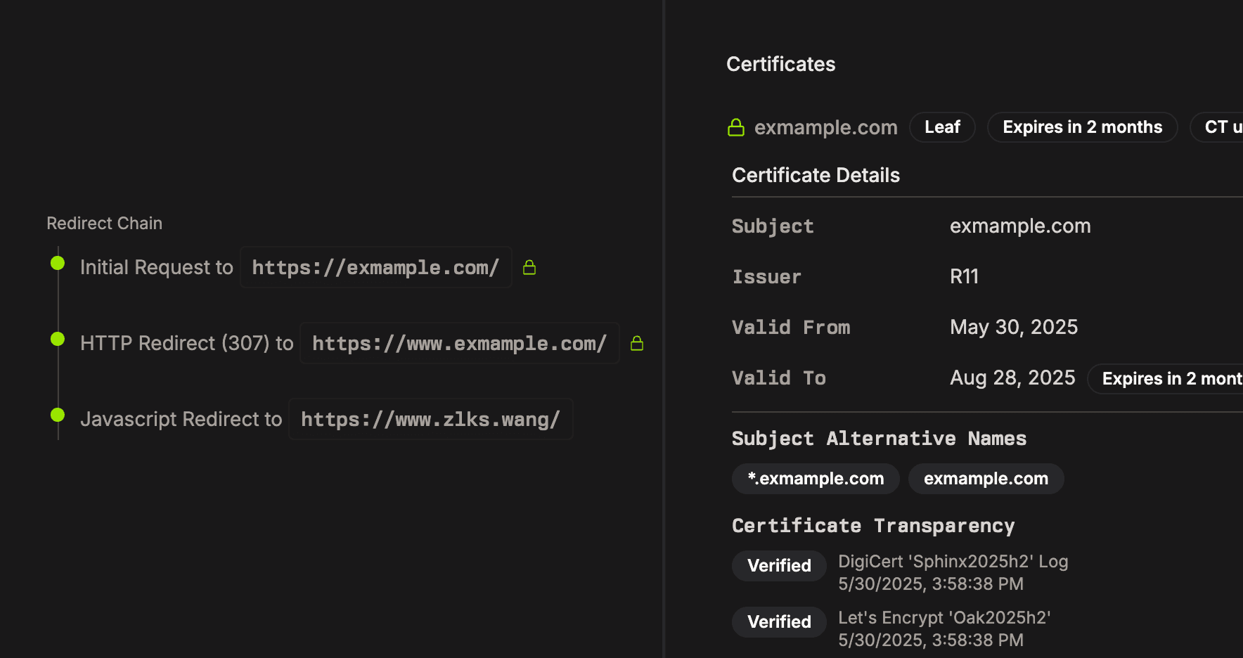 This lets you quickly assess certificate legitimacy, expiration, and transparency for every hop in the redirect path, making it easier to spot suspicious or misconfigured certificates.